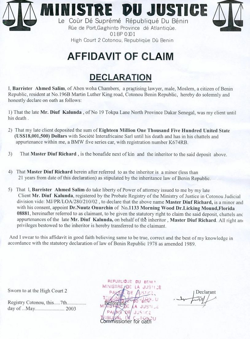 I am Barrister Ahmed Salim, of Abeh Woha Chambers Cotonou Benin Republic, the Family attorney to the Kalunda family of Dakar