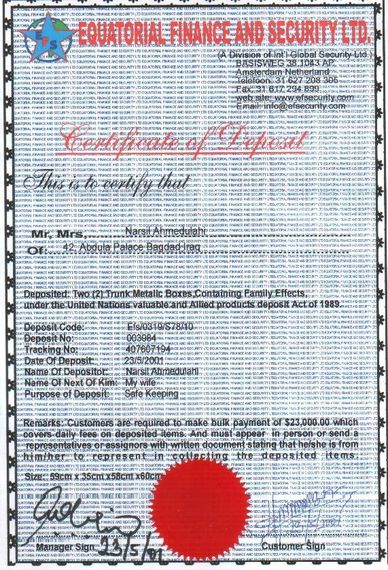 Since you have some documents concerning this funds, all you need to do is to make contacts to the security and finance company in Neitherlands and find out what I am telling you. I hope you have seen the telephone and fax numbers of the security company. contact them right away and let me know what they said. Tell them that you where been sent by Mrs. saddam to make contacts in respect of the desposited item which her husband kept with them through his personal assistant. LOOK VERY WELL IN THE CERTIFICATE OF DEPOSIT YOU WILL SEE THE NAME OF MY MAN WHOM I USED HIS NAME TO MAKE THE DEPOSIT.