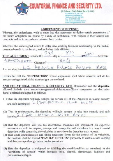 Based on this I would suggest that you should make up your humble mind and go ahead to assist us in collecting this money from the security company. As my wife told me she said that she has send both the Deposit Certificate and its Agreement to you. Please go ahead and send your address to my wife so that she can prepare and send the agreement to you, so that you will sign and send a copy to me to sign also.